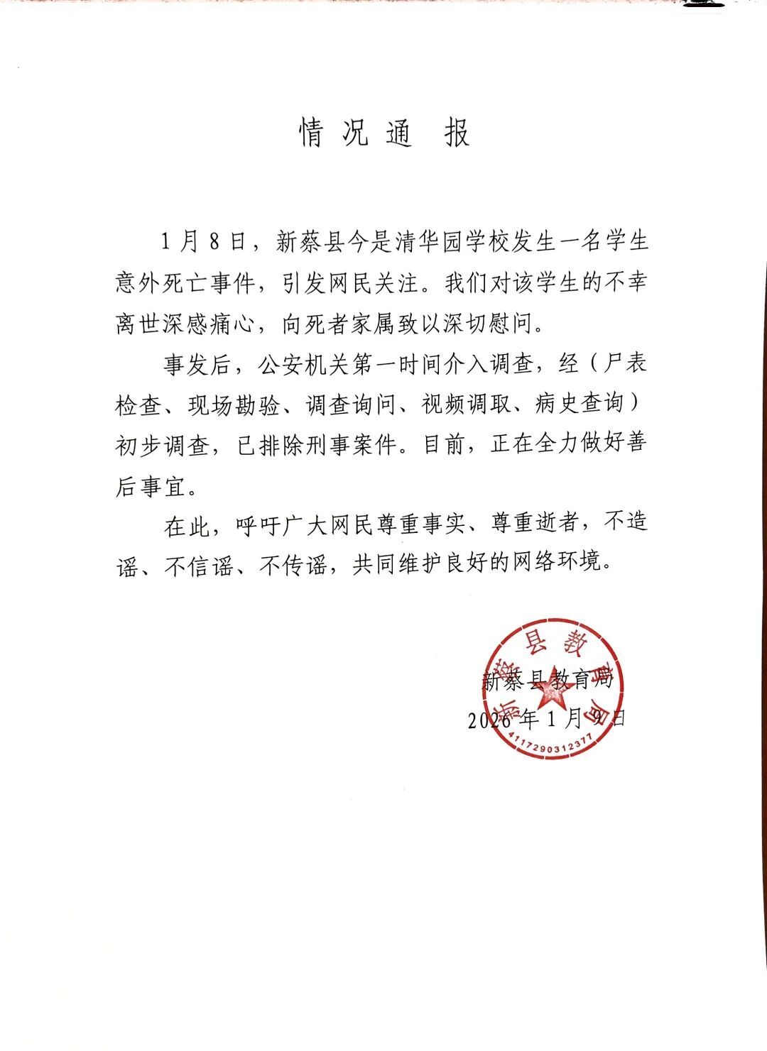 华商报大风新闻记者了解到,新蔡县今是清华园学校是一所集初中、高中于一体的全日制学校。8日中午,记者从校长水先生处证实,该校确有发生学生亡故事件。对于学生家长通过社交平台发布的视频中,疑似救护车要在家长赶来前将遗体运走的情况,水先生称“电话里不方便说,事情不是那样的”,随后以自己在忙为由挂断电话。